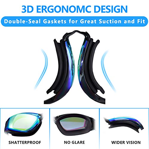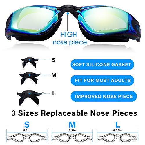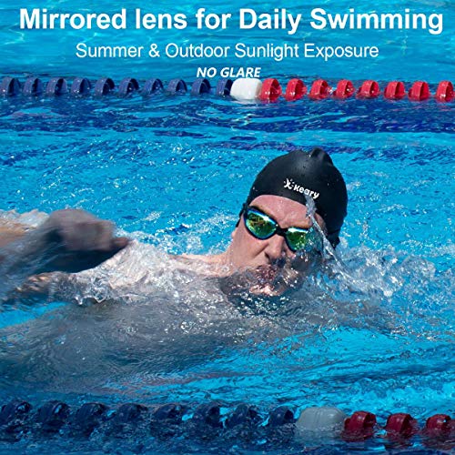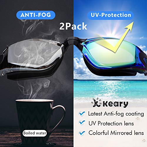 The Keary 2 Pack Anti-Fog Swim Goggles are an excellent choice for swimmers of all ages. Whether you're an adult, a teenager, or a child aged 6 and above, these goggles offer a range of features that enhance your swimming experience. The package includes two stylish swimming goggles, ear plugs, three interchangeable nose pieces, and packing boxes.One of the standout features of these goggles is the anti-fog and UV protection. The inner lenses are coated with the latest anti-fog treatment, ensuring clear vision underwater without blurring or distortion. Additionally, the outer surfaces have UVA/UVB protection to shield your eyes from harmful UV rays and bright lights. This makes them suitable for both indoor and outdoor swimming.The Keary goggles also boast a no-leak design. The double-deck seal and ergonomic fit ensure that water stays out, allowing you to swim without any distractions. The soft silicone frame provides a comfortable fit for different face shapes, preventing any discomfort or red marks around the nose.Adjusting these goggles is super easy thanks to the one-button click system. The well-designed clasp allows you to put on and take off the goggles quickly without tangling your hair. The upgraded button is robust and durable, ensuring long-lasting use.Another advantage is the crystal-clear vision provided by the special-designed lens and latest electroplating technique mirrored coating. These features enhance clarity underwater, making your swimming sessions more enjoyable.In summary, the Keary 2 Pack Anti-Fog Swim Goggles are a versatile and high-quality option for anyone looking to improve their swimming experience. With features like anti-fog treatment, UV protection, no-leak design, easy adjustability, and crystal-clear vision, these goggles cater to the needs of swimmers of all ages.