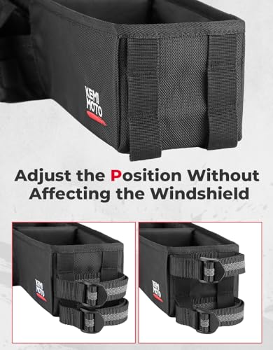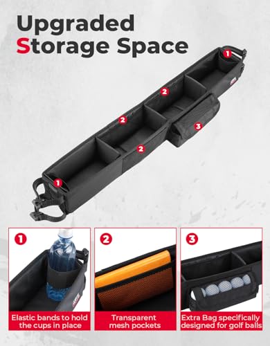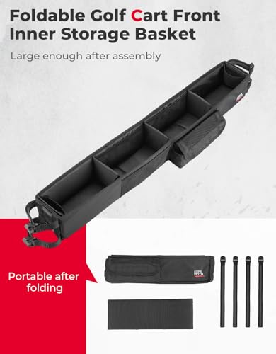 Golf cart enthusiasts looking for a practical and durable storage solution will find the KEMIMOTO Upgraded Golf Cart Front Storage Basket an excellent choice. This versatile storage tray is designed to be compatible with all major golf cart models, including EZGO, Club Car, Drive, ICON, and Kandi Electric Golf Carts. One of the standout features of this product is its upgraded storage space. The basket is equipped with elastic bands at both ends to secure water bottles, transparent mesh pockets ideal for keys, mobile phones, and wallets, and an additional pouch specifically designed for golf balls. This thoughtful design ensures that your essentials are always within reach and neatly organized.Installation is a breeze with no drilling required. The organizer tray includes three holes on both sides and four enhanced friction surface straps, allowing you to adjust the position of the storage box according to the windshield's location. This user-friendly design makes it easy to set up and take down as needed.Constructed from sturdy and wear-resistant 1680D Oxford cloth, the KEMIMOTO storage basket promises durability and longevity. The internal PP support plates prevent collapse or deformation, ensuring that the basket maintains its shape even under heavy use.With dimensions of 33.27'' L x 4.33'' W x 4.17'' H and a generous 9.7L volume, this storage solution offers ample space for all your golfing necessities. The included square magic sticker partition divides the box into four separate compartments, each with a 2.3L capacity, allowing for organized storage of various items.Overall, the KEMIMOTO Upgraded Golf Cart Front Storage Basket is an essential accessory for any golf cart owner looking to enhance their cart's functionality while keeping their gear organized and easily accessible.