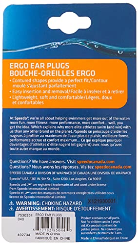 The Speedo Unisex-Adult Swim Training Ergo Ear Plugs are an excellent choice for swimmers seeking a secure and comfortable ear protection solution. Made from high-quality thermoplastic rubber (TPR), these ear plugs offer an ergonomic design that ensures a watertight fit, minimizing any potential leakage. Whether you are training, competing, or simply enjoying a swim, these ear plugs provide the reliability and comfort you need.Key features of the Speedo Ergo Ear Plugs include:- **Ergonomic Fit:** The specialized shape of the ear plugs provides a secure and watertight fit, reducing the risk of water entering the ear canal.- **High-Quality Material:** Made from soft and comfortable TPR, these ear plugs are PVC free, ensuring they are safe for prolonged use.- **Easy to Use:** The design allows for easy insertion and removal, making them convenient for swimmers of all levels.- **Reusable and Durable:** These ear plugs come with a handy storage case, keeping them clean and ready for their next use.With over a decade on the market and consistently positive reviews, the Speedo Ergo Ear Plugs have proven to be a reliable choice for swimmers. Their compact dimensions make them easy to carry in your swim bag, and their lightweight nature ensures they do not interfere with your swim performance. Whether you are a professional swimmer or someone who enjoys regular pool sessions, these ear plugs are designed to enhance your swimming experience. Choose Speedo, the world's #1 swim brand, and enjoy the comfort and protection of their expertly designed Ergo Ear Plugs.